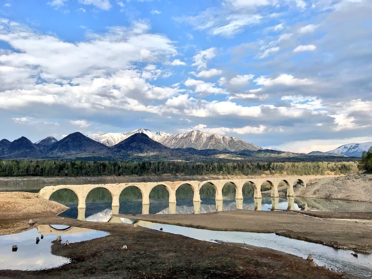 *タウシュベツ橋は、人造湖のダム湖「糠平湖」の水位変化により見え方が大きく変わります。