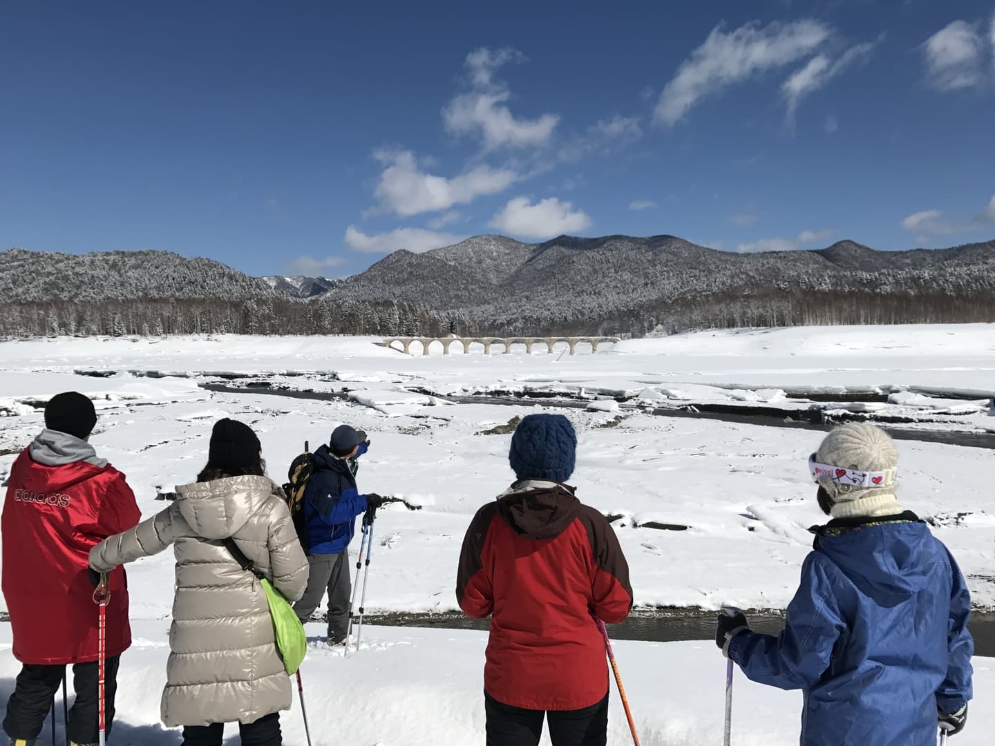 糠平湖の湖上横断が危険な時期となりましたら、スノーシューを使って森を抜け、