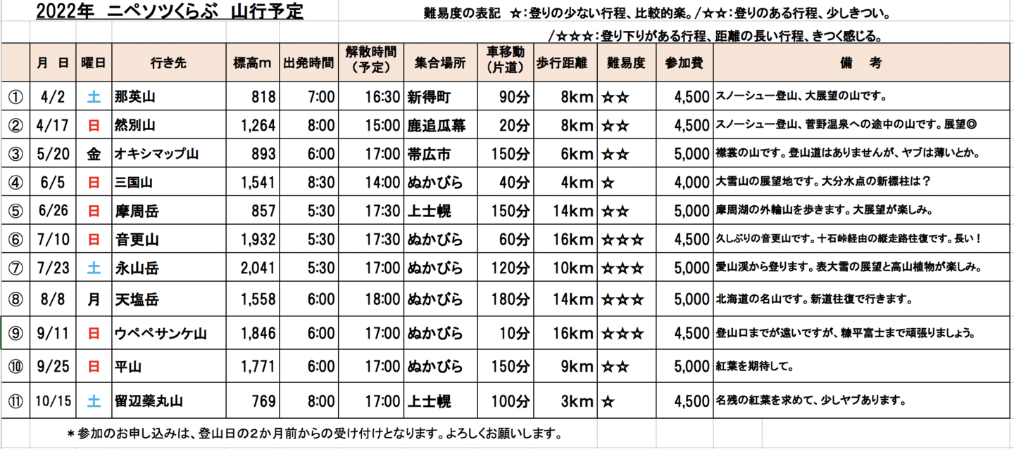 *各山行には参加費が設定されています。下記の年間計画表をご参考ください。